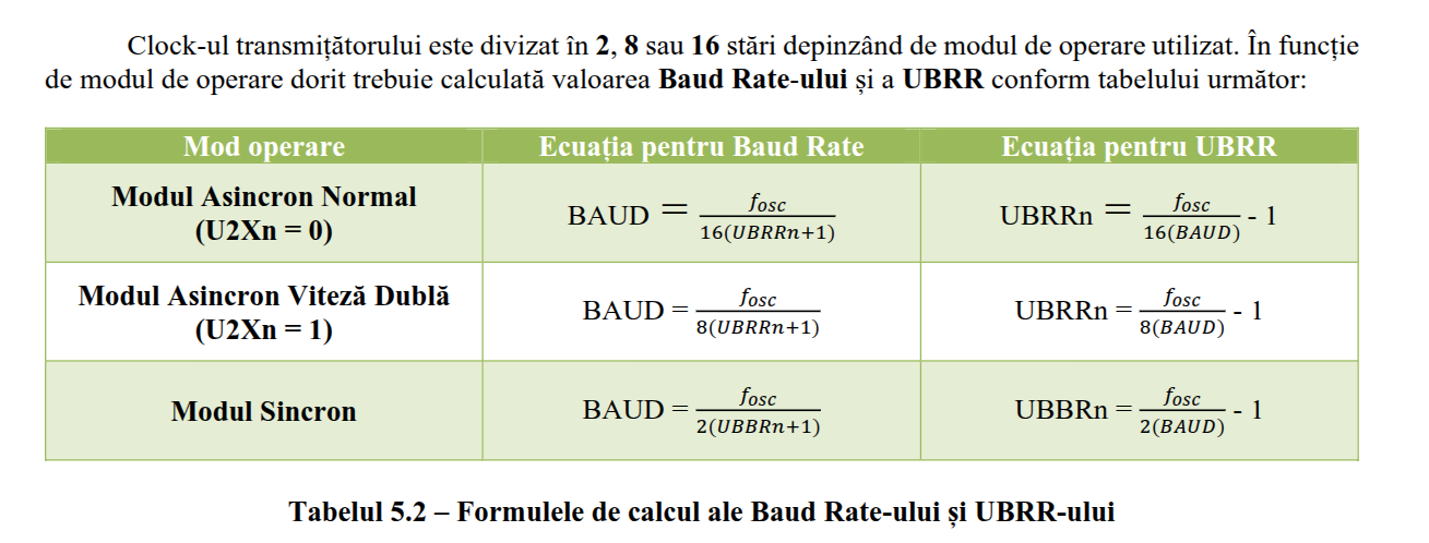 Setarea Baud Rate-ului: se calculează valoarea UBRR și se încarcă registrele UBRRH și UBRRL.