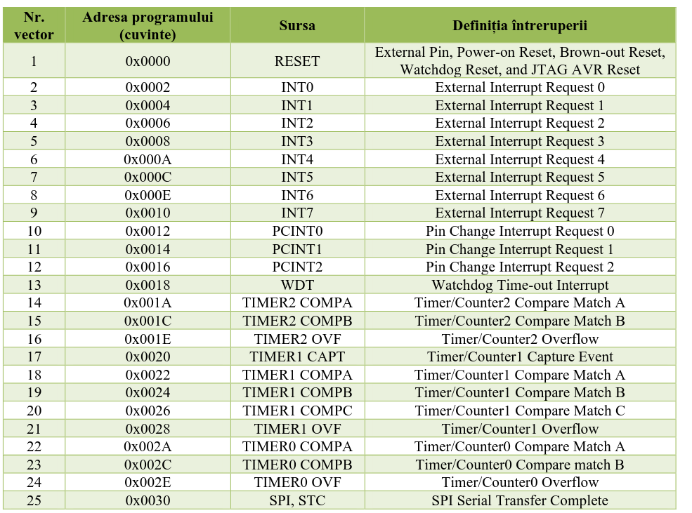 listă de adrese la începutul memoriei Flash. Fiecare tip de întrerupere are un “loc” rezervat (un vector). cât numărul vectorului este mai mic (adresa mai apropiată de $000), cu atât prioritatea este mai mare. RESET are prioritatea maximă, urmat de INT0.
