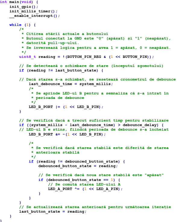 Acest cod implementează un algoritm de debounce software pentru a filtra zgomotul electric de la o intrare mecanică (buton T4 / PE6), asigurând o singură tranziție logică per apăsare. Metoda se bazează pe polling temporizat în bucla principală, utilizând o bază de timp precisă generată de Timer0. Acesta este configurat în modul CTC pentru a declanșa o întrerupere la fiecare 1 ms, incrementând un contor global (system_millis). La detectarea unei tranziții pe pinul de intrare, programul înregistrează momentul și intră într-o perioadă de așteptare de 50 ms. O acțiune (comutarea LED-ului A) este validată și executată doar dacă starea pinului rămâne stabilă pe toată durata acestui interval, eliminând astfel citirile false cauzate de contactele mecanice oscilante. LED-ul B oferă feedback vizual, fiind activ doar pe durata intervalului de debounce.