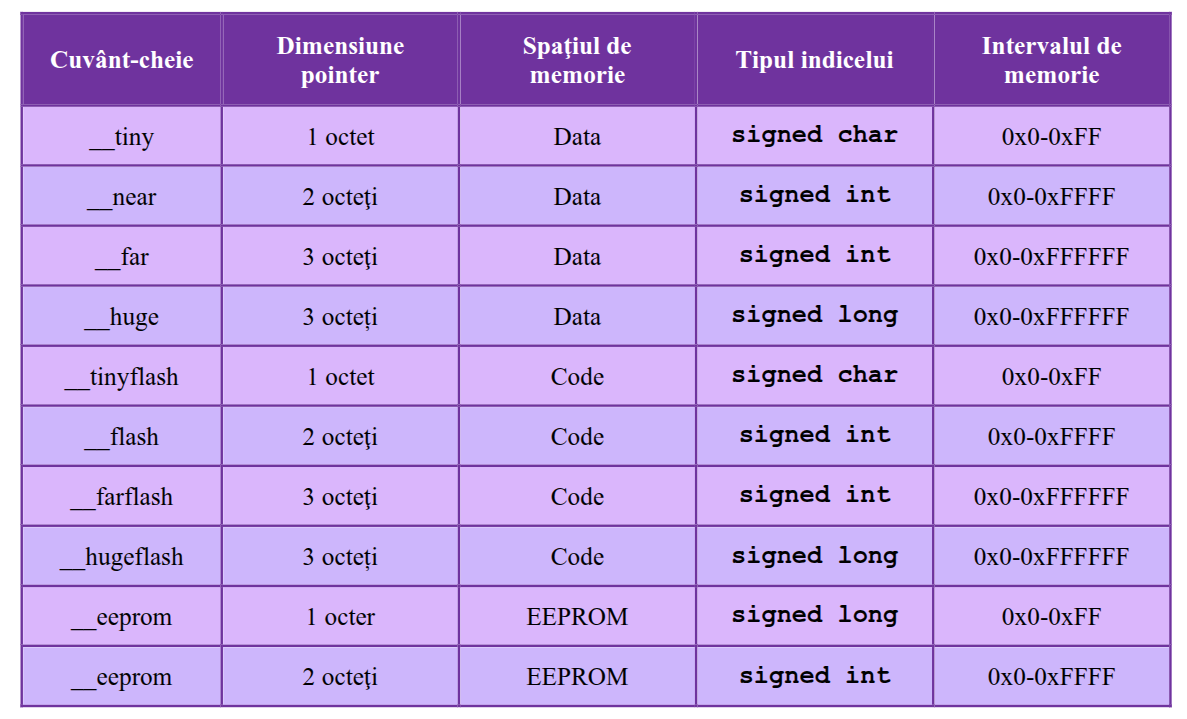 Un pointer trebuie să conţină informaţia necesară pentru a specifica locaţia unui anumit tip de memorie. Acest fapt denotă că dimensiunile pointerilor sunt diferite pentru diferite tipuri de memorie. În IAR C/C++ Compiler For AVR este interzisă conversia pointerilor de tipuri diferite fără utilizarea unui cast explicit.