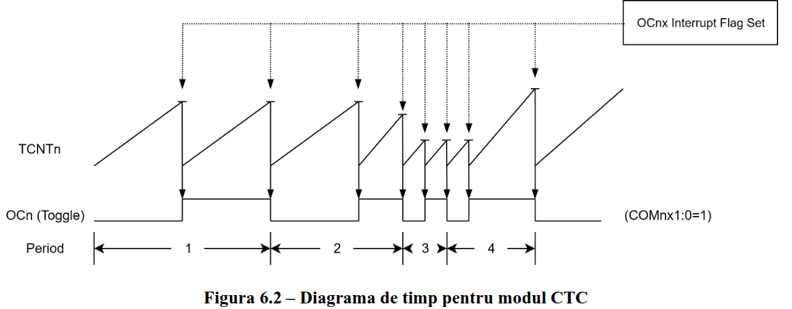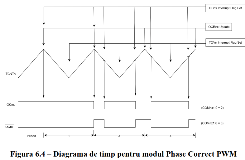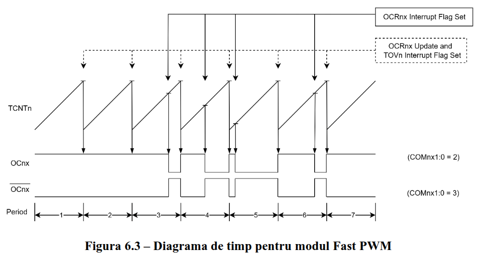 • BOTTOM: reprezintă valoarea minimă a numărătorului (counter); • MAX: reprezintă valoarea maximă a numărătorului (counter); • TOP: counter-ul ajunge la valoarea TOP când devine egal cu cea mai mare valoare din secvența de numărat, iar această valoare poate fi fixă (MAX) sau valoarea stocată în registrul OCRnx (output compare register) în funcție de modul de operare.