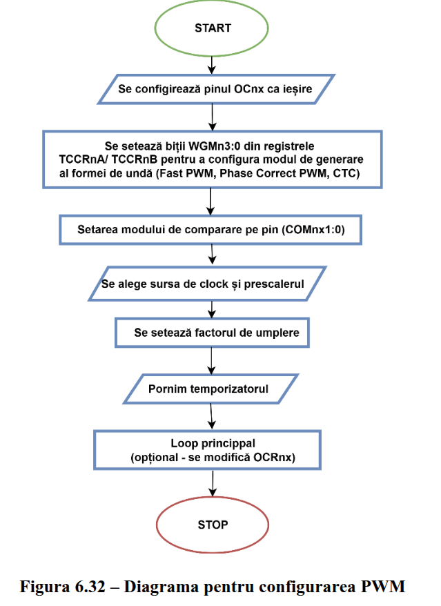 6. Setarea factorului de umplere (duty cycle) – se scrie în registrul OCRnx.