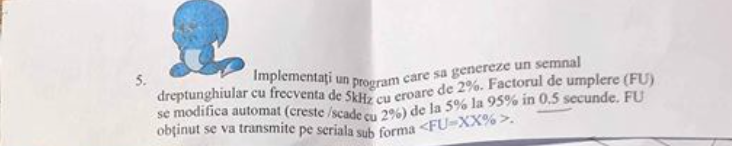 Frecvența: Este determinată de registrul ICR3. Calculul (FOSC/N)/FREQ - 1 setează pragul de sus pentru a obține exact 5 kHz.
