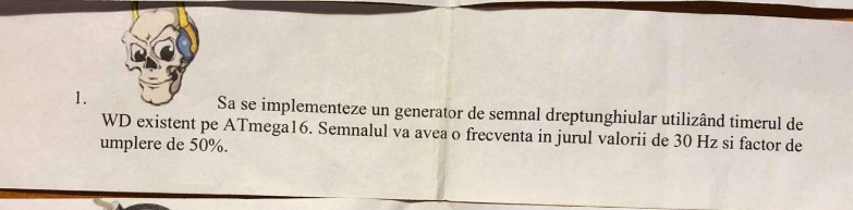 Dacă totuși trebuie să folosești varianta cu Reset (cerința examenului), asigură-te că scrii registrele dintr-o singură mișcare (fără |=) și că menționezi că frecvența este limitată de oscilatorul intern de 128kHz.